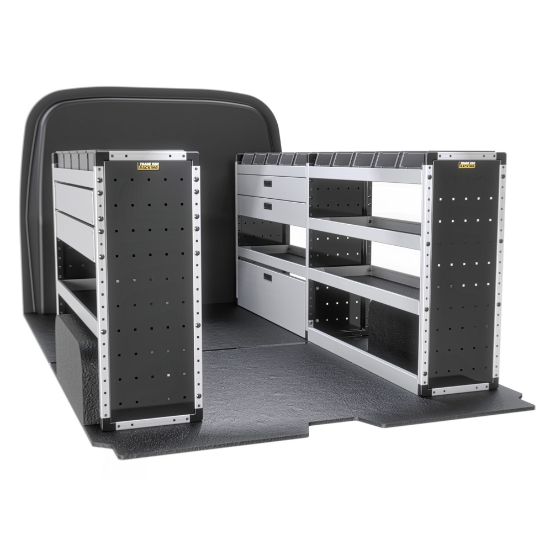For the ultimate efficiency and versatility, the Gold package provides shelves, a drop-down door, a drawer, rubber matting, and racking bins to meet all your storage requirements. This full package includes both passenger and driver-side shelving.