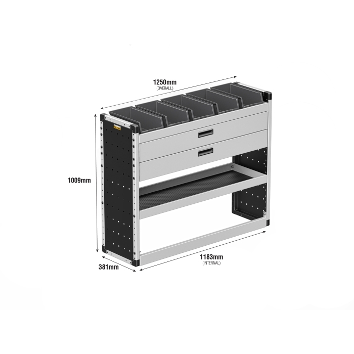 For the ultimate efficiency and versatility, the Gold package provides a passenger side shelf, drawers, rubber matting, and racking bins to meet all your storage requirements.