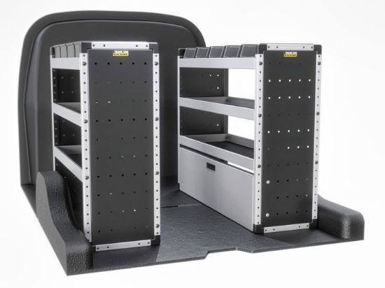 The Silver package, for added convenience, is complete with shelves, a drop-down door, rubber matting, and racking bins to keep your tools and supplies organized. The full kit includes passenger and driver-side racking.