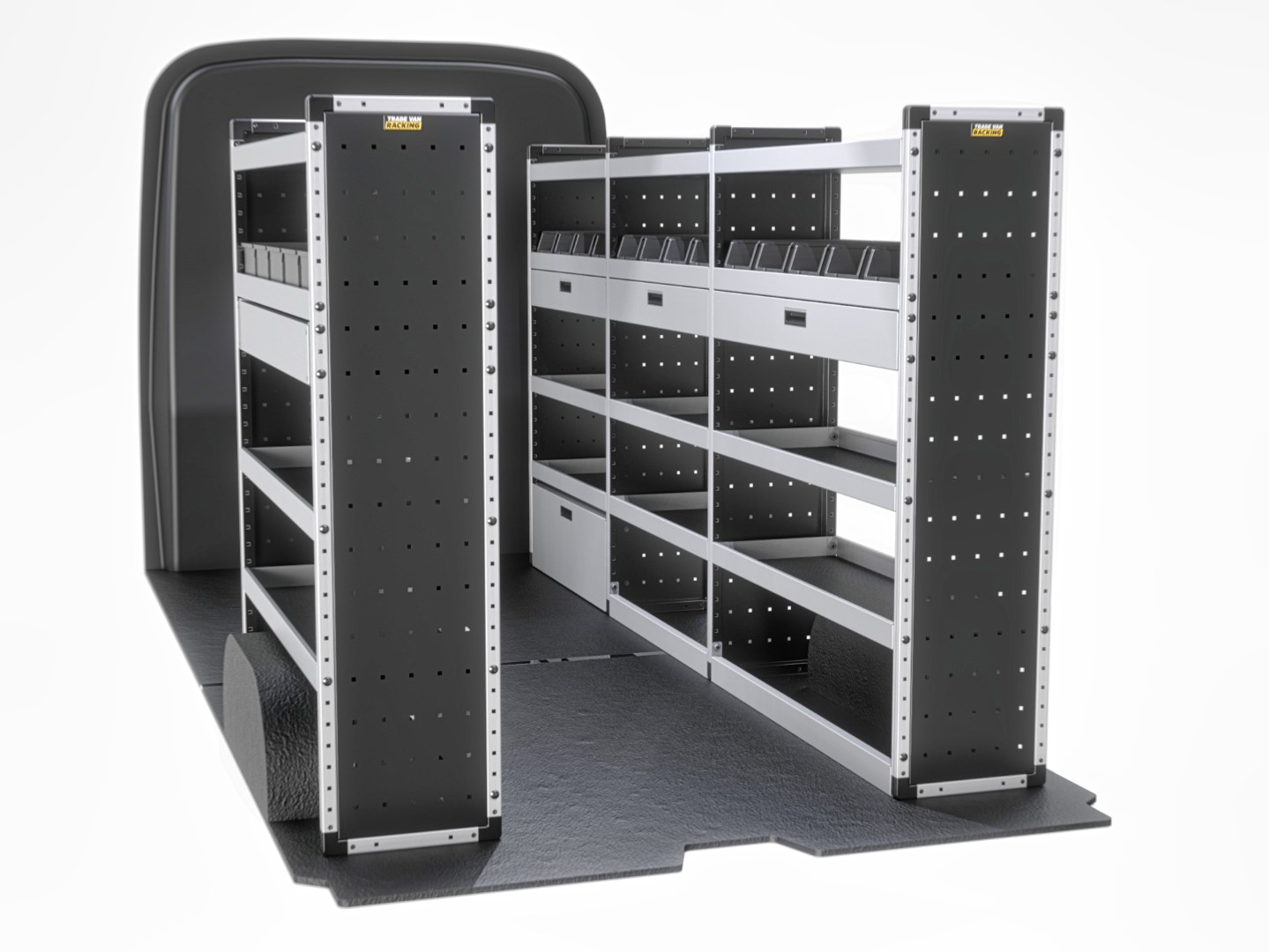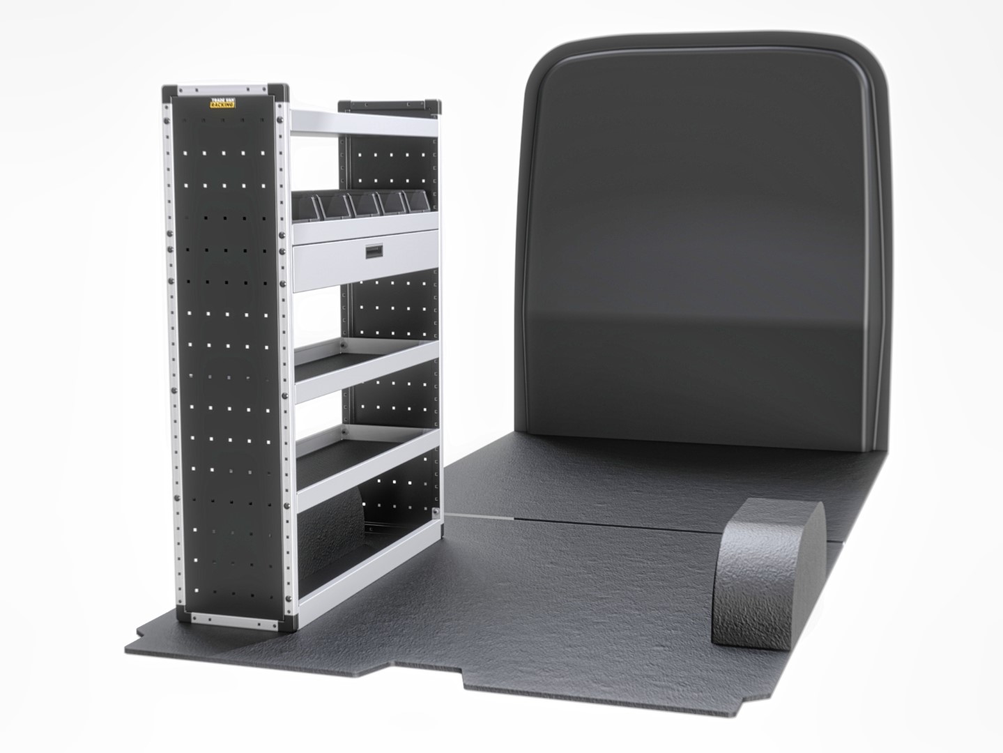 For the ultimate efficiency and versatility, the Gold package provides shelves, a drop-down door, a drawer, rubber matting, and racking bins to meet all your storage requirements. This full package includes both passenger and driver-side shelving.