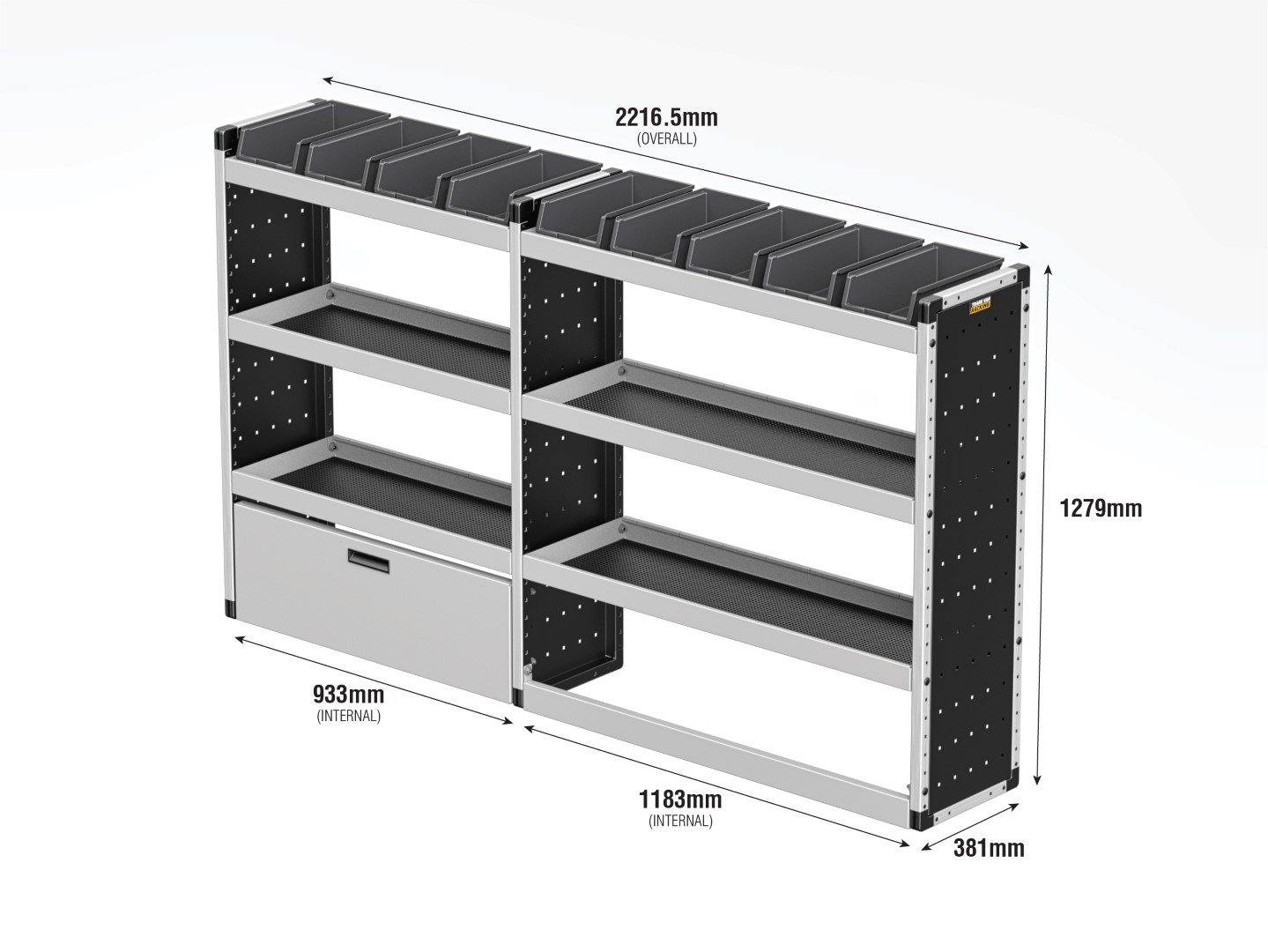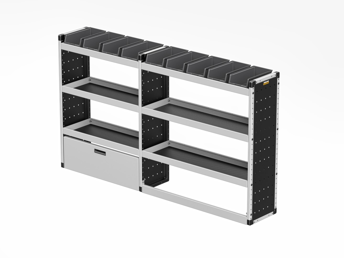 A premium product at a non-premium price, our Trade Van Racking is straightforward to assemble and has been crash-tested to industry standards. Available as single or double units to best utilise the load area, and a choice of fully adjustable straight and angled shelves, allows the carrying of tool cases and smaller components.
