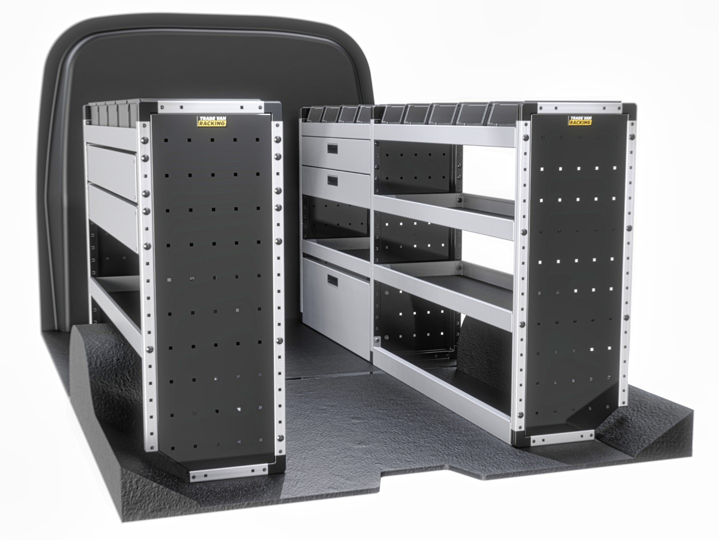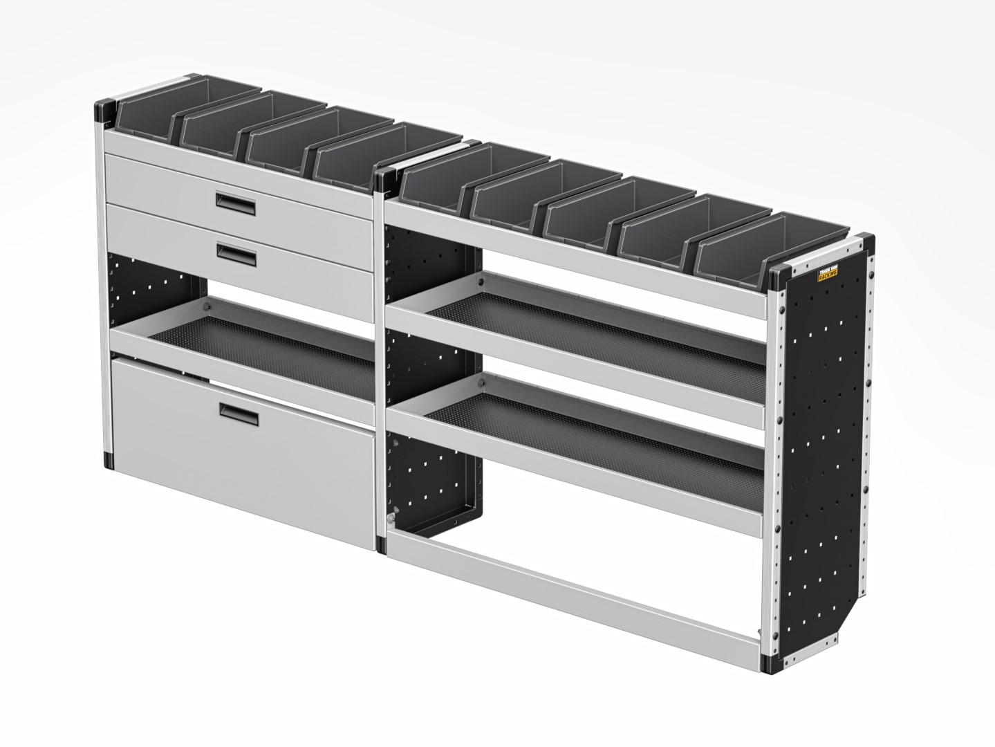 For the ultimate efficiency and versatility, the Gold package provides shelves, a drop-down door, a drawer, rubber matting, and racking bins to meet all your storage requirements. This full package includes both passenger and driver-side shelving.