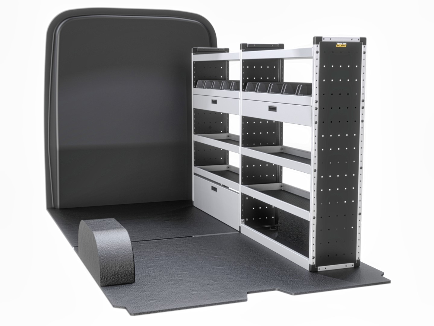 For the ultimate efficiency and versatility, the Gold package provides shelves, a drop-down door, a drawer, rubber matting, and racking bins to meet all your storage requirements. This full package includes both passenger and driver-side shelving.