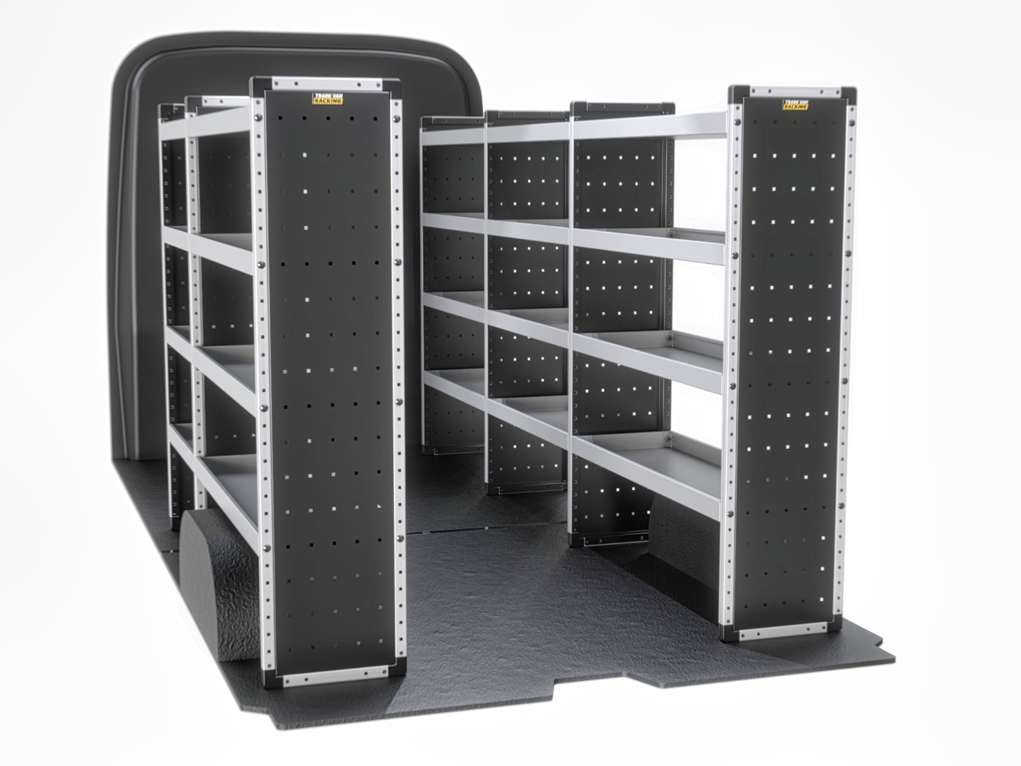 flexible metal van racking solution to store and organise power tools and components effectively and efficiently.