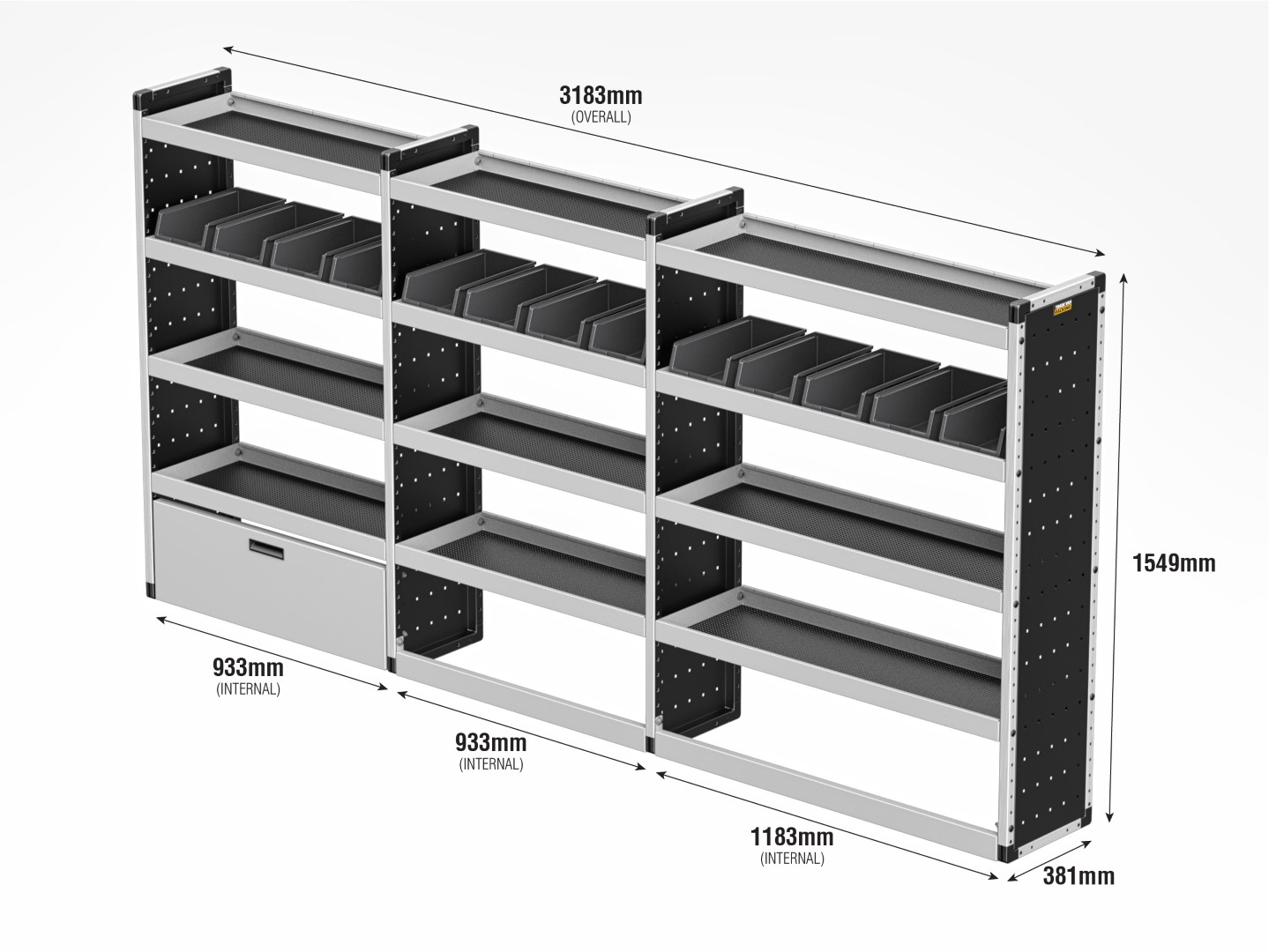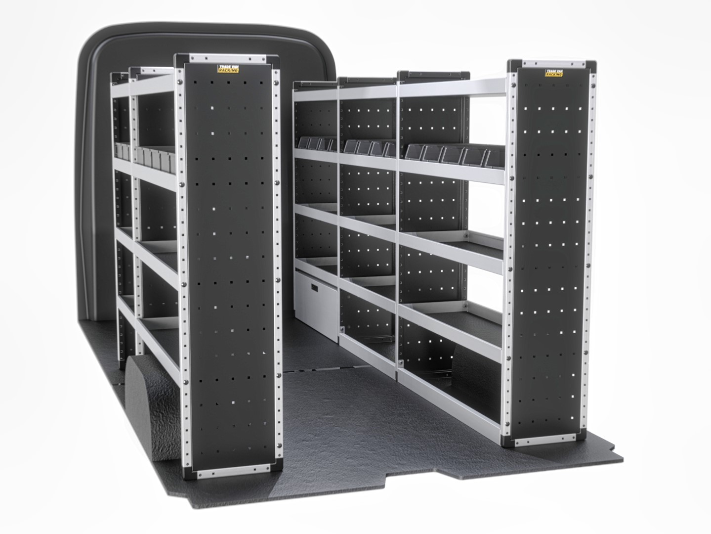 flexible metal van racking solution to store and organise power tools and components effectively and efficiently.