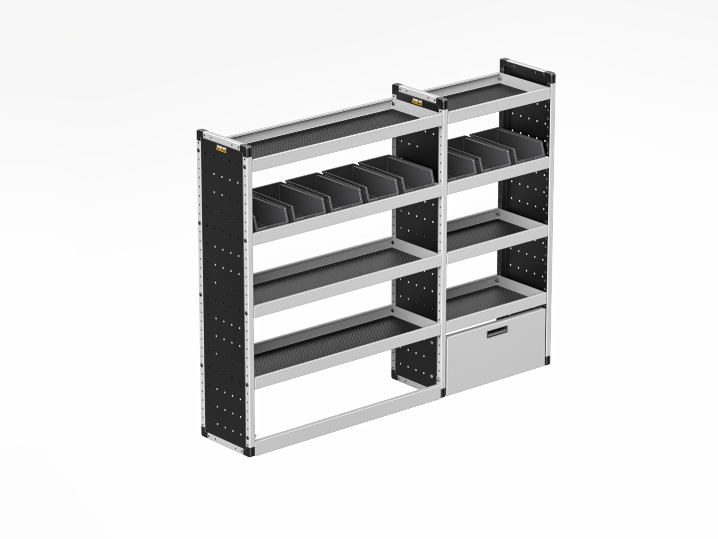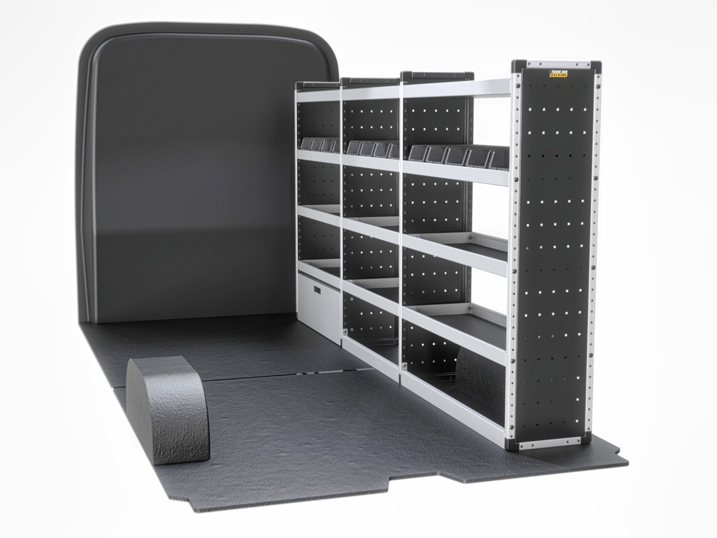 The Silver package, for added convenience, is complete with shelves, a drop-down door, rubber matting, and racking bins to keep your tools and supplies organized. The full kit includes passenger and driver-side racking.
